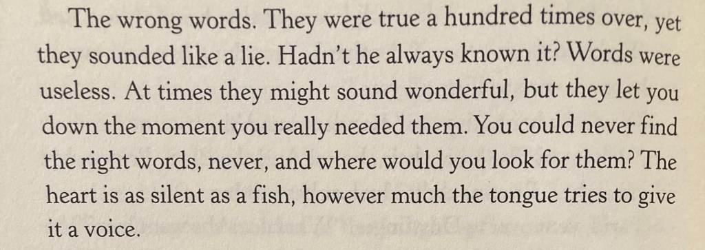 The wrong words. They were true a hundred times over, yet they sounded like a lie. Hadn’t he always known it? Words were useless. At times they might sound wonderful, but they let you down the moment you really needed them. You could never find the right words, never, and where would you look for them? The heart is as silent as a fish, however much the tongue tries to give it a voice.
