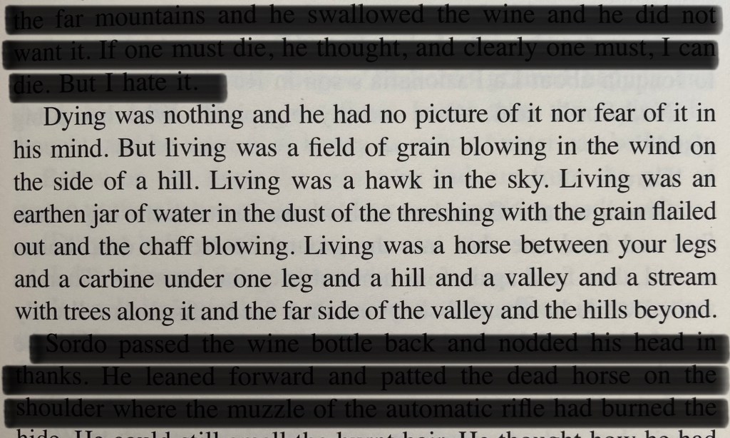 Dying was nothing and he had no picture of it nor fear of it in his mind. But living was a field of grain blowing in the wind on the side of a hill. Living was a hawk in the sky. Living was an earthen jar of water in the dust of the threshing with the grain flailed out and the chaff blowing. Living was a horse between your legs and a carbine under one leg and a hill and a valley and a stream with trees along it and the far side of the valley and the hills beyond.
