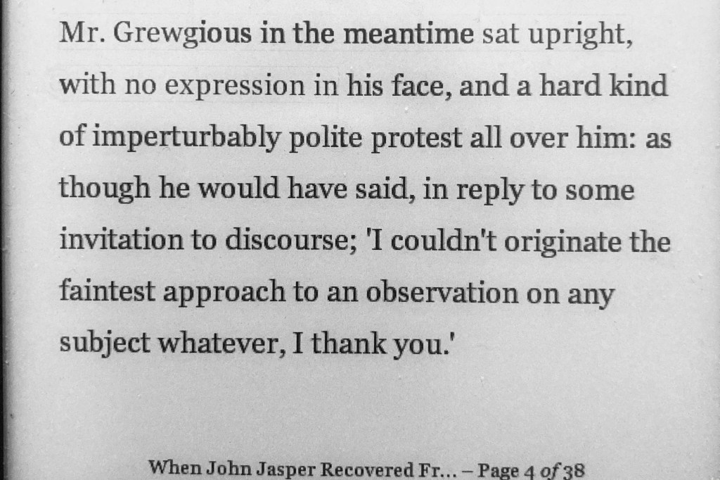 Mr. Grewgious in the meantime sat upright, with no expression in his face, and a hard kind of imperturbably polite protest all over him: as though he would have said, in reply to some invitation to discourse; ‘I couldn’t originate the faintest approach to an observation on any subject whatever, I thank you.’