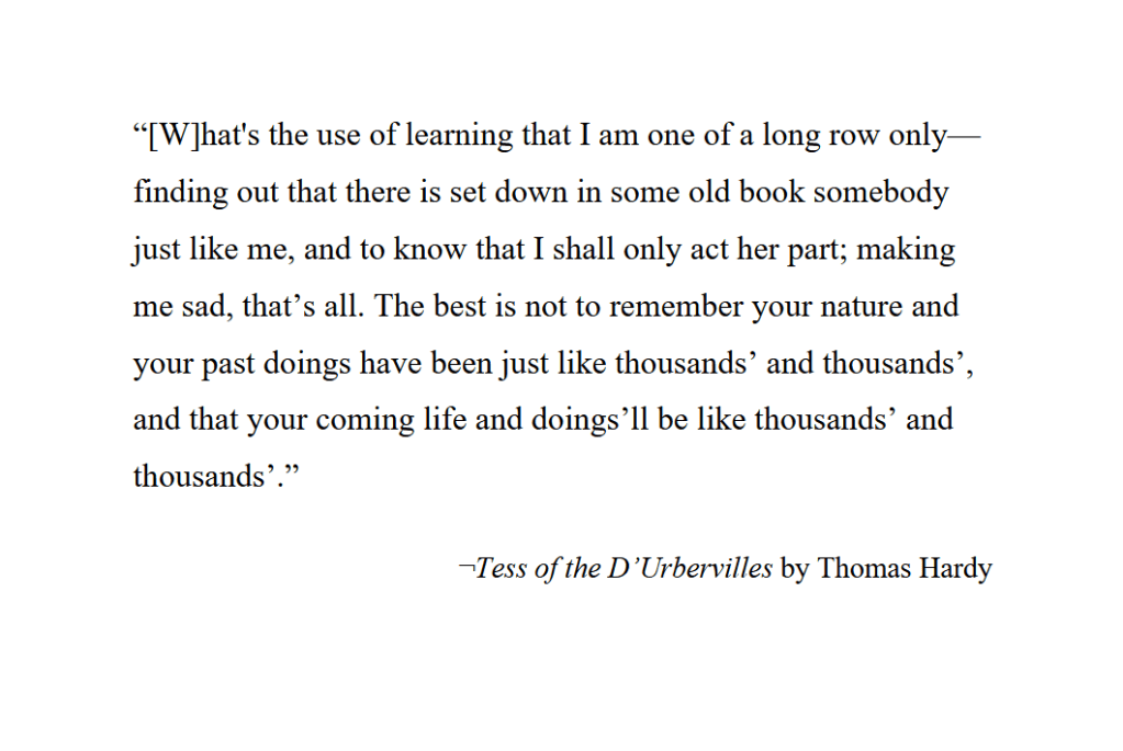 Tess, as written by Hardy, rightly points out the patterns of literature in replicating consistent patterns of human behaviour, but unlike her I have almost always seen it as a comforting rather than dejecting phenomenon. Who doesn’t need the reassurance that there are others like them? Being able to relate to people is essential to living in relationships.