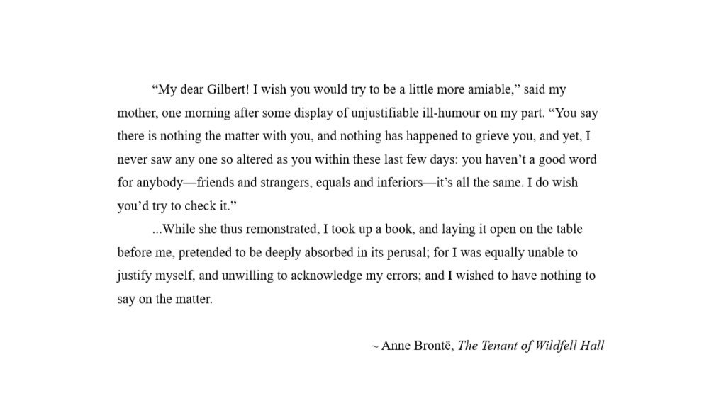“My dear Gilbert! I wish you would try to be a little more amiable,” said my mother, one morning after some display of unjustifiable ill-humour on my part. “You say there is nothing the matter with you, and nothing has happened to grieve you, and yet, I never saw any one so altered as you within these last few days: you haven’t a good word for anybody—friends and strangers, equals and inferiors—it’s all the same. I do wish you’d try to check it.”