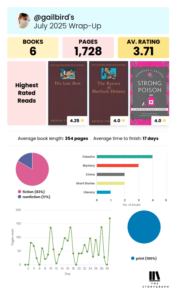 July Reading Wrap-Up | The StoryGraph Posted on August 1, 2025 by Fictitiously Yours, Gail Share this: Click to share on Tumblr (Opens in new window) Tumblr Click to share on Pinterest (Opens in new window) Pinterest Click to share on Facebook (Opens in new window) Facebook Click to share on Threads (Opens in new window) Threads More Click to share on LinkedIn (Opens in new window) LinkedIn Click to share on X (Opens in new window) X Click to share on Reddit (Opens in new window) Reddit Click to share on WhatsApp (Opens in new window) WhatsApp Click to email a link to a friend (Opens in new window) Email Like Loading...